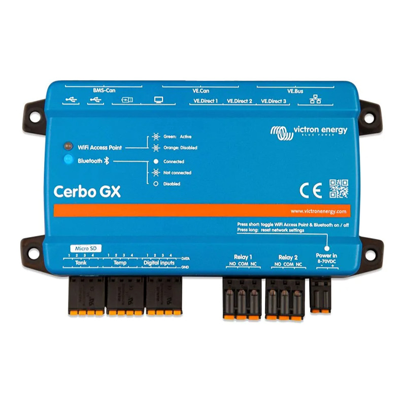 Cerbo GX to centralny system monitorujący urządzenia Victron Energy, umożliwiający zdalne zarządzanie i nadzorowanie pracy całego systemu za pośrednictwem internetu lub aplikacji mobilnej Victron Connect. Dodatkowo, istnieje możliwość podłączenia ekranu dotykowego GX Touch 50, co ułatwia bieżącą kontrolę i konfigurację systemu.